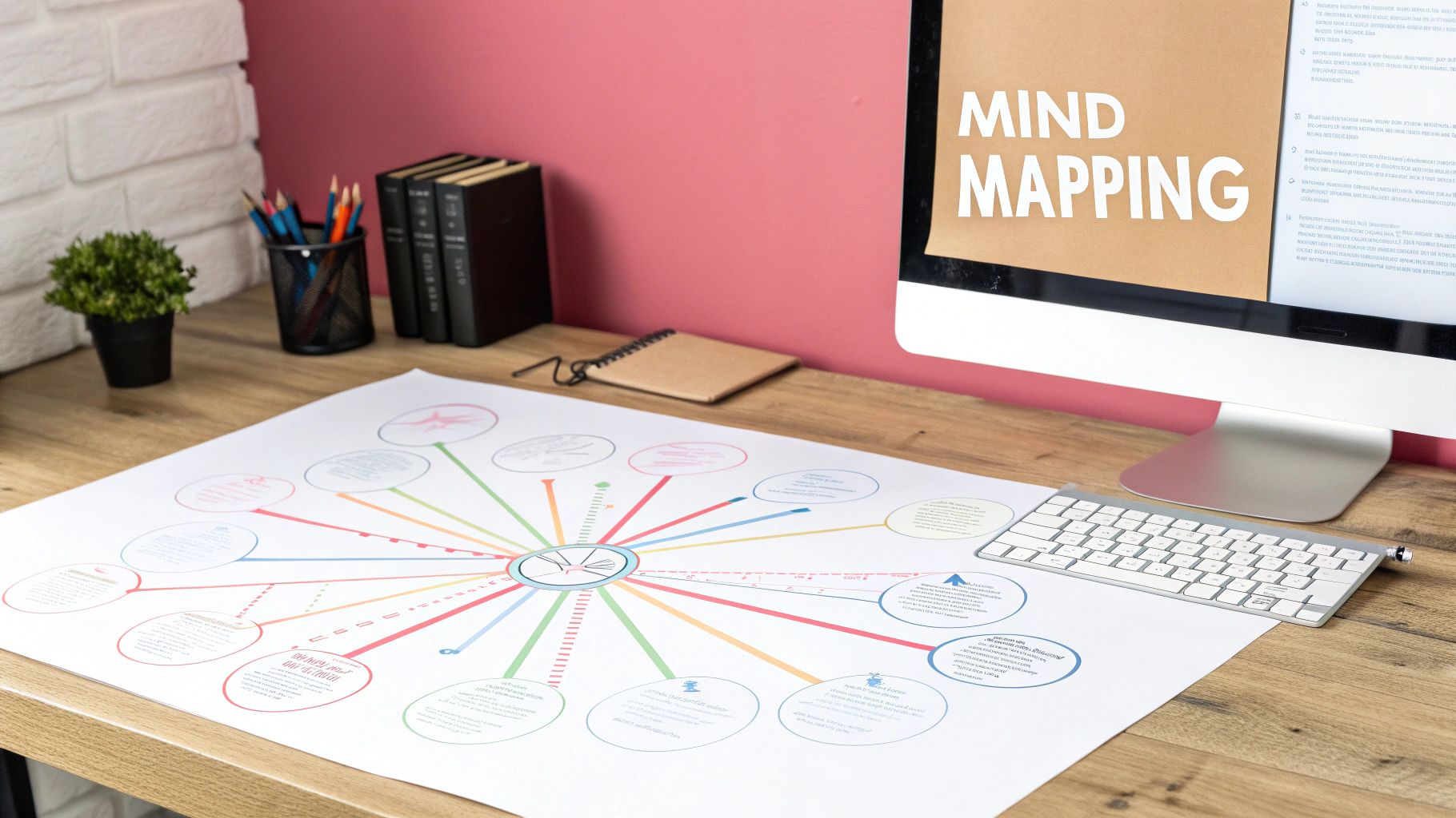 With the Mapping Method for note-taking, you start with the main idea at the center of the page and then draw branches out to subtopics, ideas, and more. Then, you can draw extra lines out of the subtopics for further details. Feel free to use color-coded themes and add boxes with different shapes. This way, you get a diagram that allows you to connect ideas in a more visual way.